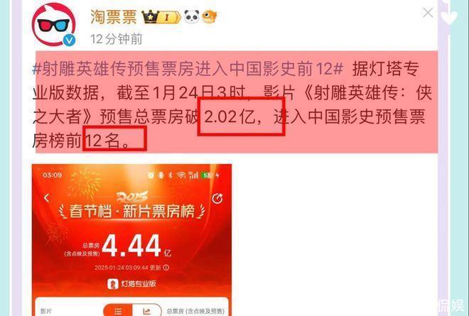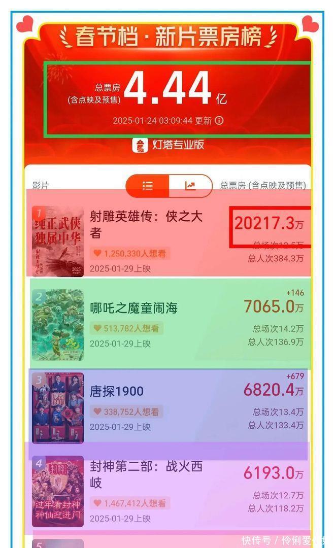 胁制到凌晨三点,预售票房破两个亿。再次破记录,成为中国电影史上,最快破两个亿的电影,参加中国影视出手票房榜前12名,比预售票房第二名《哪吒闹海》多了近三倍的预售票房,排在第三位的是陈想诚导演,王宝强刘昊然主演的《唐探1900》,现在扫数这个词春节档电影票房4.4亿,肖战主演的《射雕骁雄传》就占了两个多亿,就问你,厉不猛烈!